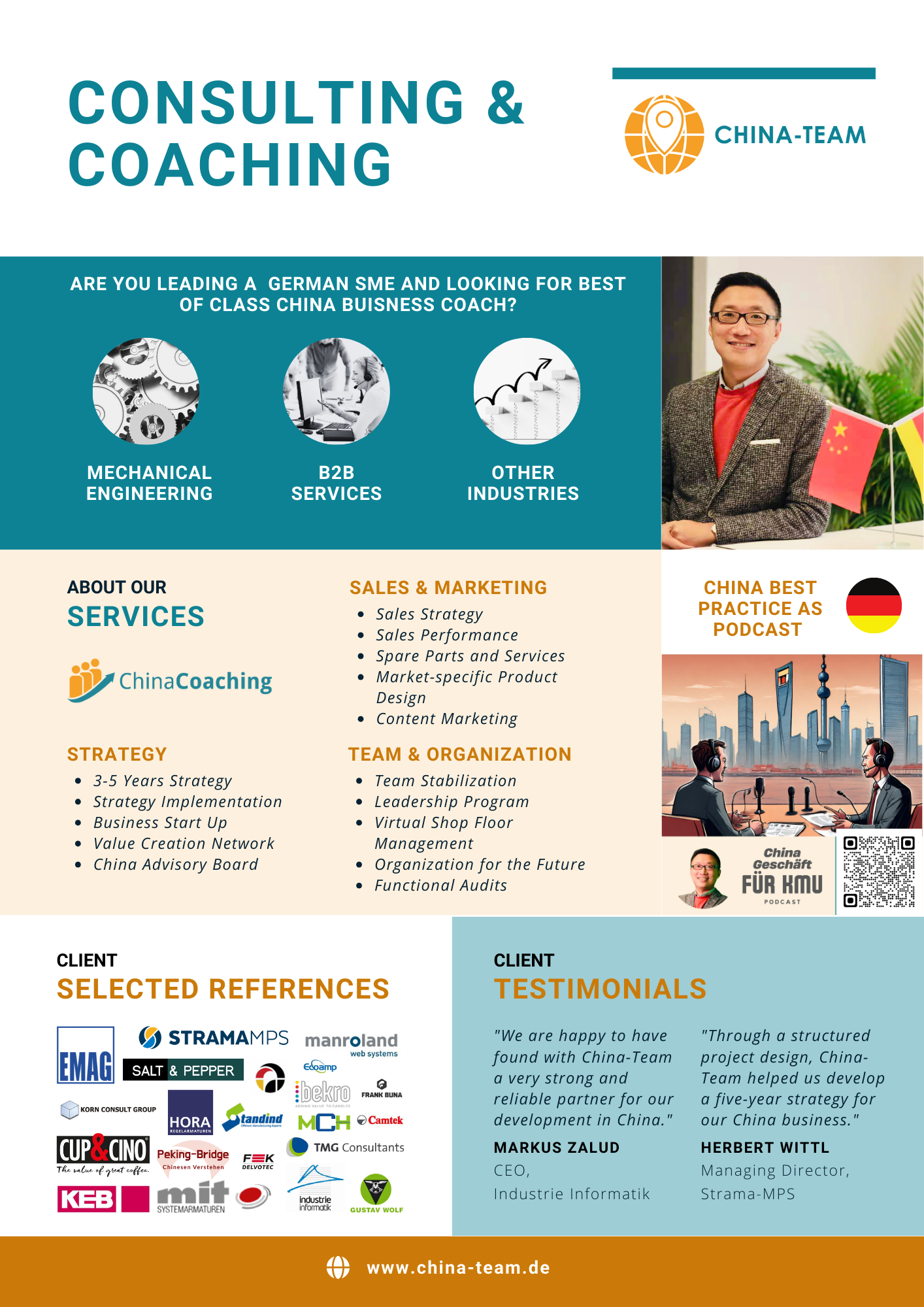 Insbesondere für Geschäftsführer und Gesellschafter der mittelständischen deutschen Unternehmen ist es von großer Bedeutung, mit Hilfe kompetenter Beratung den chinesischen Markt zu verstehen, mögliche Trends, Chancen und Handlungsbedarfe frühzeitig vor den Wettbewerbern zu identifizieren.