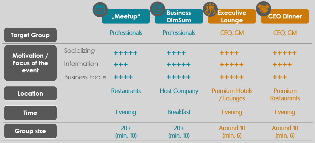 ChinaClub Veranstaltungen sind sehr vielfältig und bieten den Mitgliedern unterschiedliche Möglichkeiten sich auszutauschen, in Kontakt zu treten und Neues zu Lernen. In vier Formaten werden wirtschaftliche, technologische und kulturelle Themen behandelt.