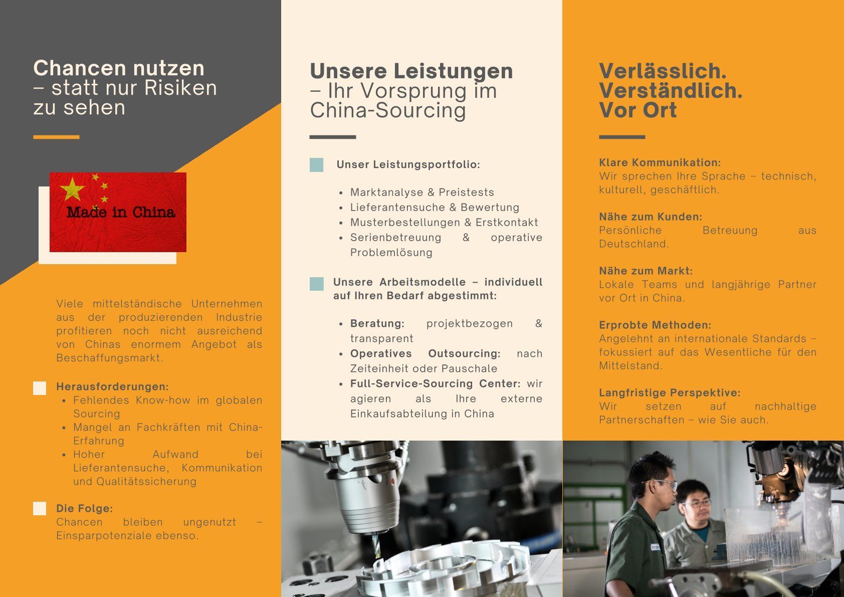 Viele mittelständische Unternehmen schöpfen das Potenzial Chinas als Beschaffungsmarkt noch nicht ausreichend aus. Mit unserem ChinaPlus Sourcing Center unterstützen wir Sie bei Lieferantensuche, Kommunikation, Qualitätssicherung und Kostenoptimierung – effizient, sicher und praxisnah. Mehr Informationen finden sie in unserem Flyer.